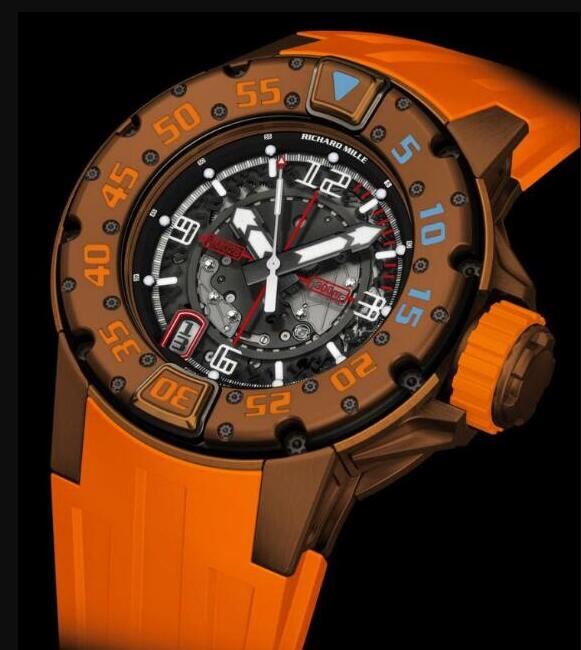 Collaboration RM 65 - 01 McLaren W1 Exclusive Design: This model is a collaboration between Richard Mille and McLaren. The case is made of Carbon TPT® carbon fiber, measuring 43.84 × 49.94 × 16.19 mm. A major design highlight is its embedded "double-layer" bezel. The outer Carbon TPT® carbon fiber bezel is set on a satin-brushed and polished Grade 5 titanium alloy bezel, with a thickness of only 0.5 mm at its thinnest point, making it the thinnest bezel in the brand's history. The crown, inspired by the W1 sports car's driveshaft, is coated with McLaren's Papaya Orange rubber and topped with the McLaren "Speedmark" logo. The skeletonized titanium alloy dial's design is inspired by McLaren wheel rim patterns and incorporates McLaren's signature colors.